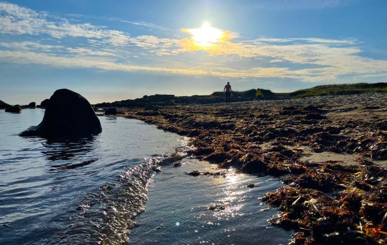 Våta klippor och tång kan vara hala. Bra grepp på skorna är viktigare än maximal dämpning.