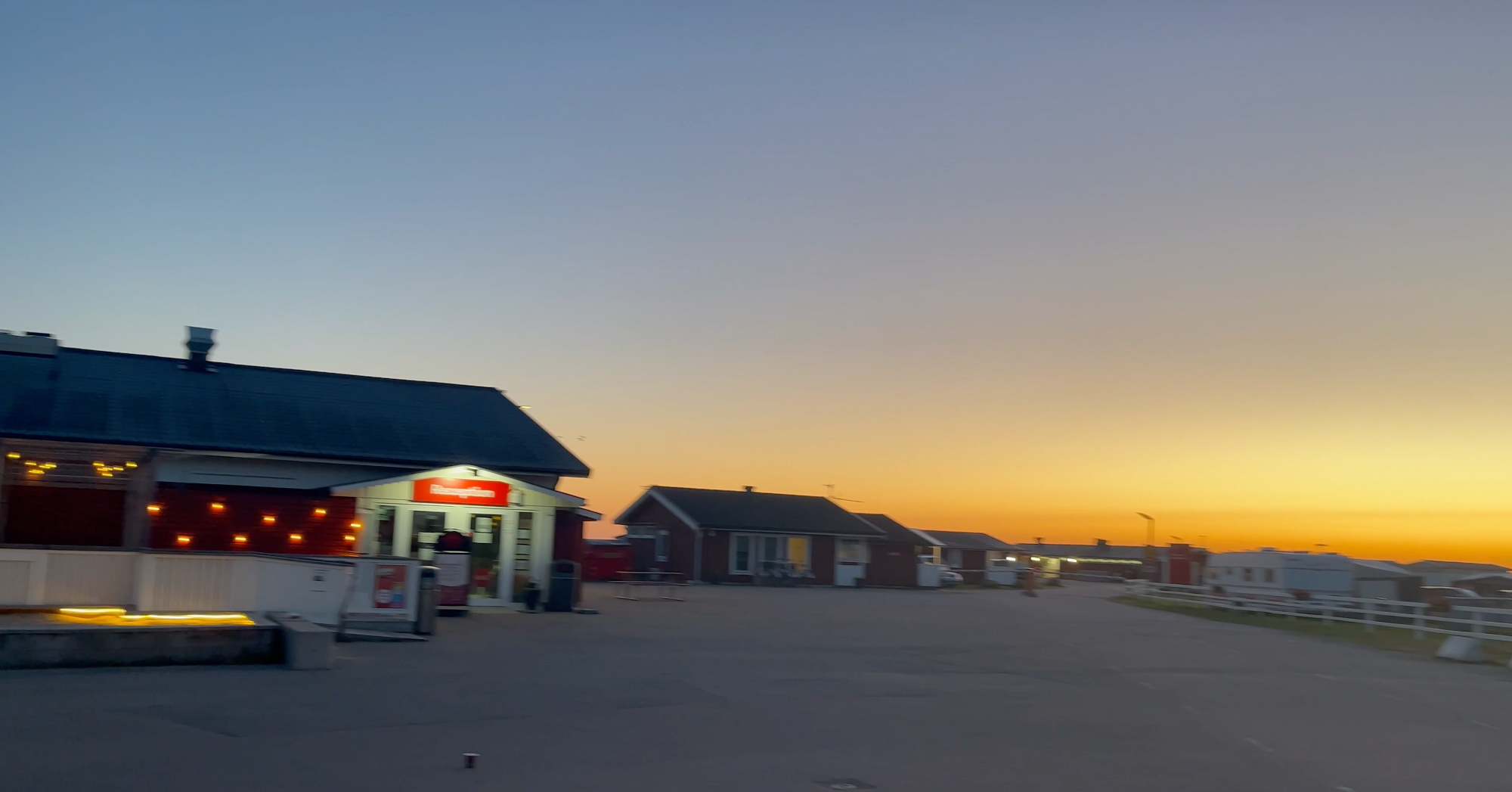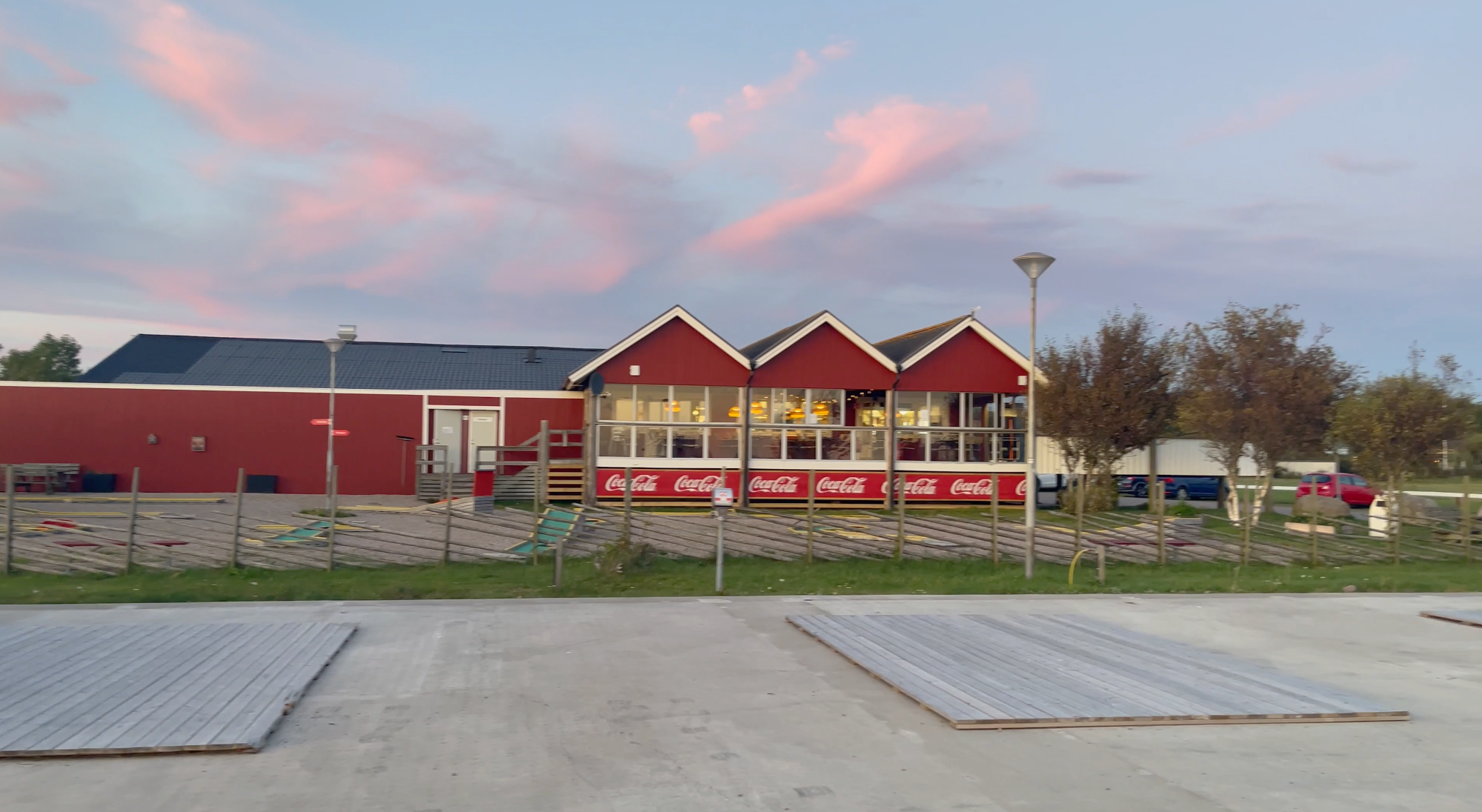 Vi beställer hamburgare och pizza, satte oss på den inglasade serveringen och ser solen sjunka ner över horisonten.