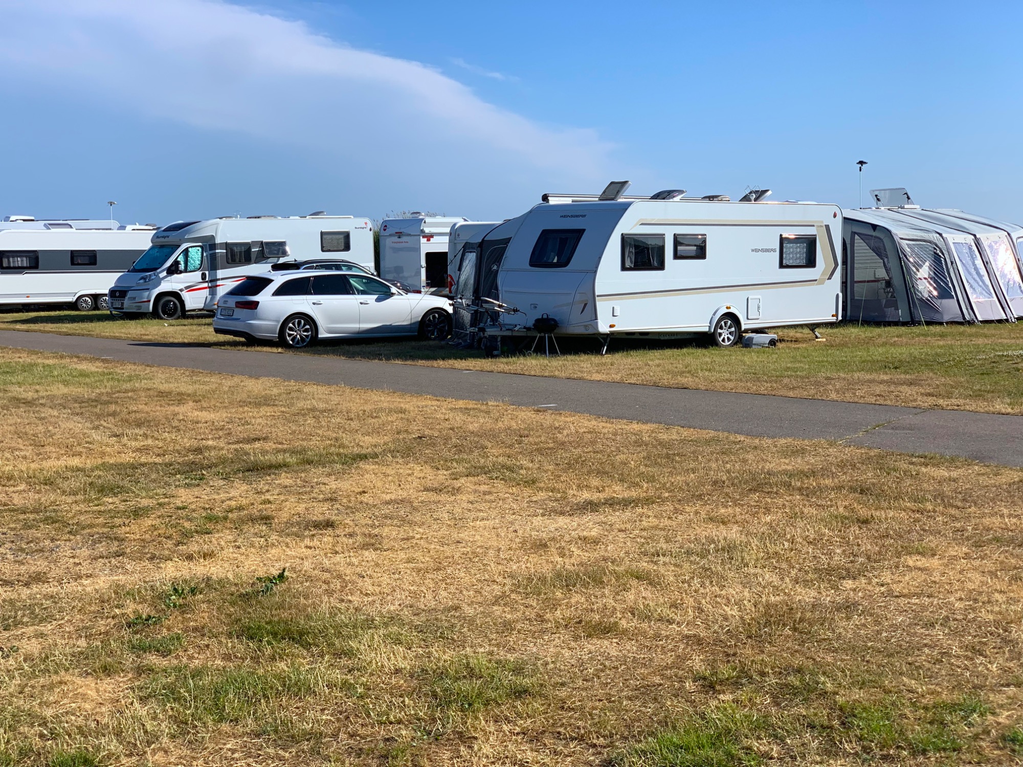 Vår upplevelse var att fördelningen låg runt 50/50 mellan husvagn och husbil, med en mindre andel tält – kanske runt fem procent. Däribland min syster, som kom ner och stannade en natt i tält. Det fungerade bra, även om det var mer rörelse under natten än annars. Inget stök, bara människor som rörde sig mellan vagnar och servicehus.