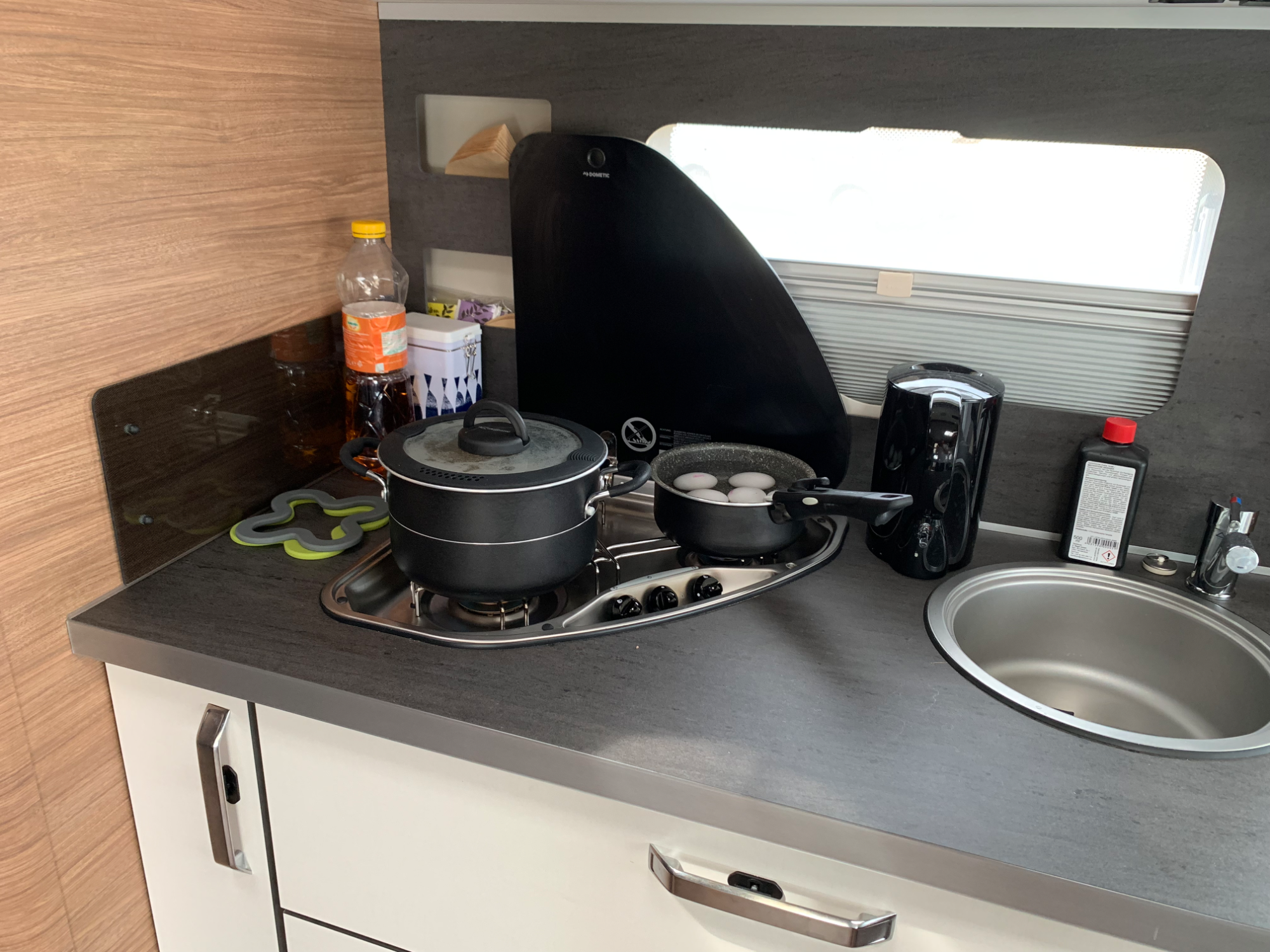 Vi lagade midsommarmaten själva i vagnen. Inget överdådigt, men klassiskt och precis det man vill ha. Kokt potatis, sill, köttbullar, gravad lax, prinskorv – allt det där som hör till.