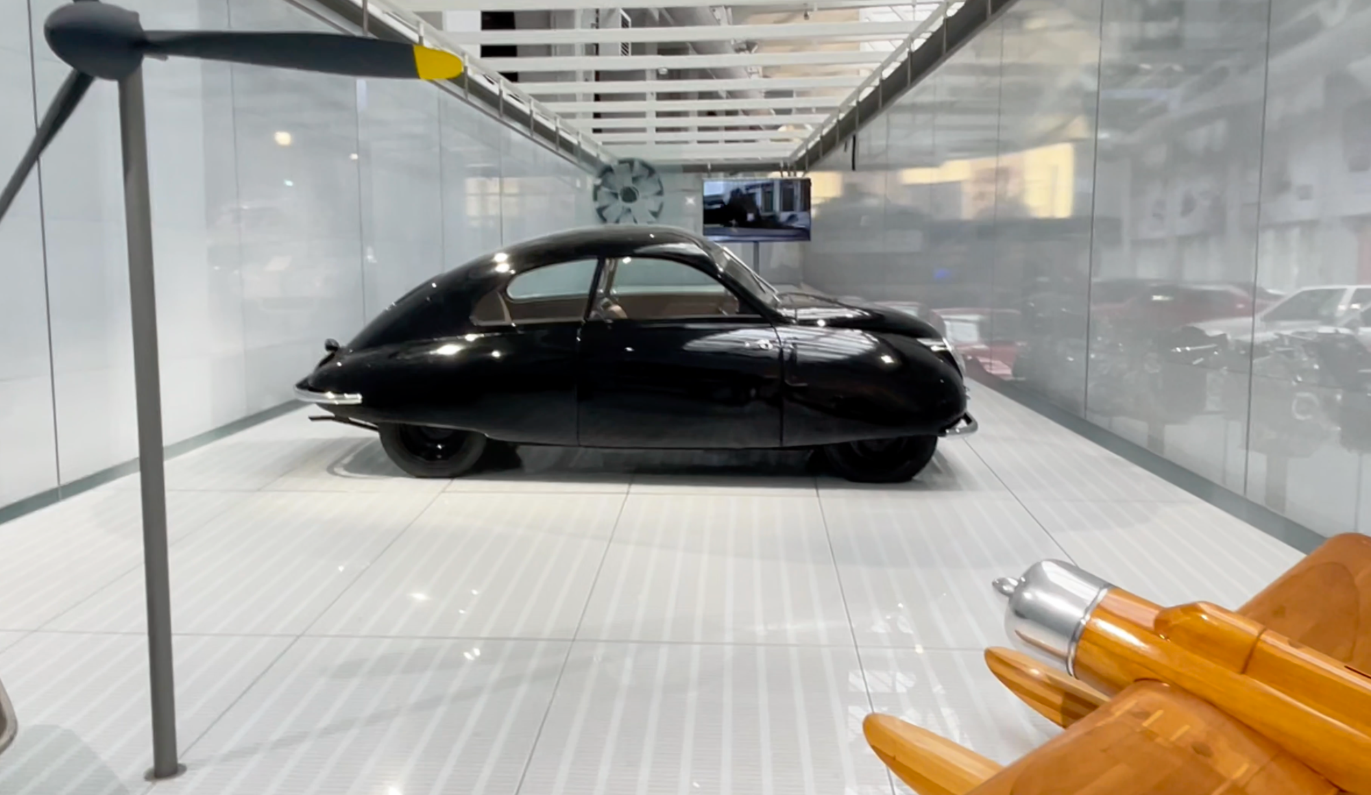 Den första bilen man stöter på är Ur-Saaben, prototypen som skulle bli Saab 92. Formen är tydligt inspirerad av flygplan – rundad, aerodynamisk och helt olik de flesta andra bilar från samma tid. Det är fascinerande att tänka på att denna bil markerar startpunkten för ett bilmärke som senare skulle bli känt över hela världen.