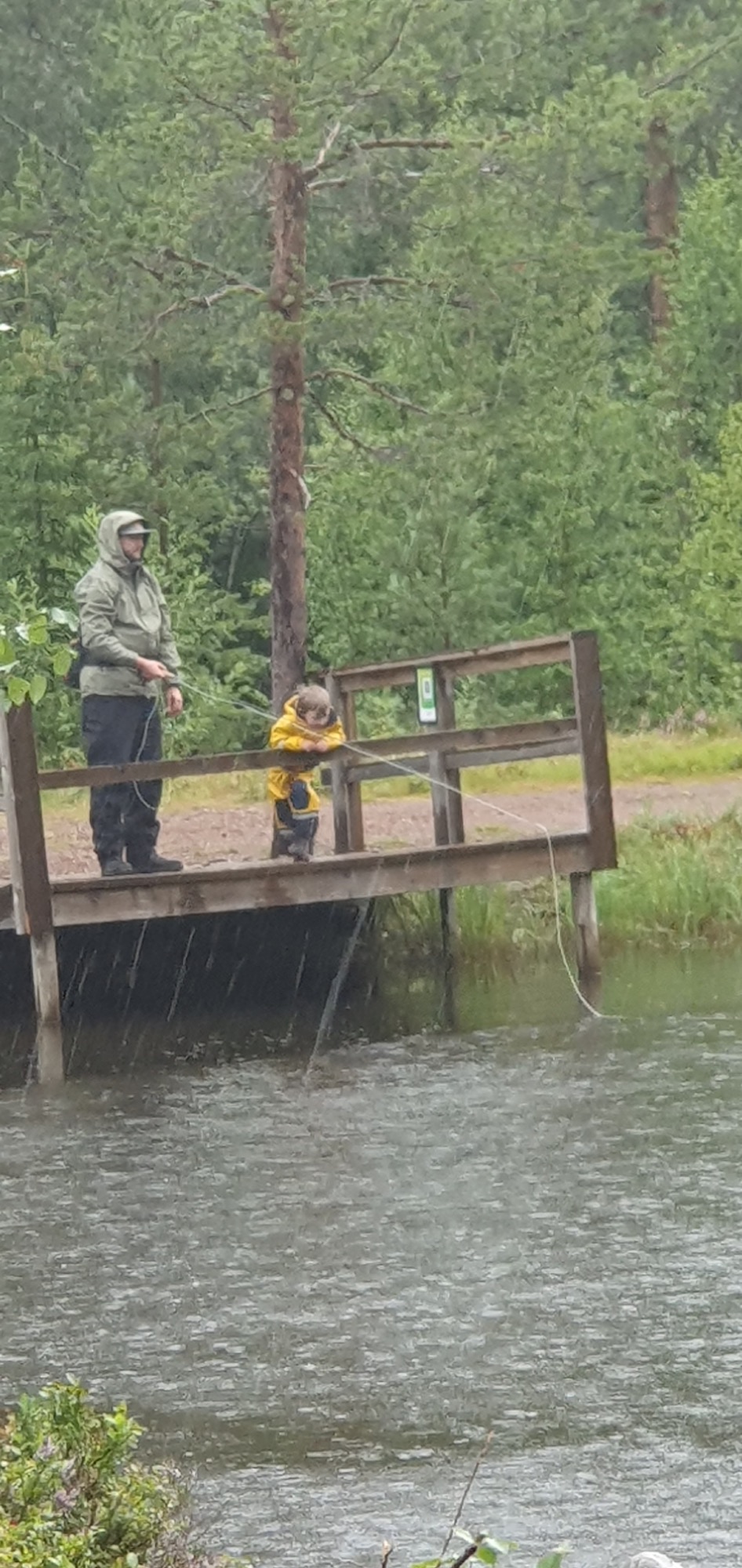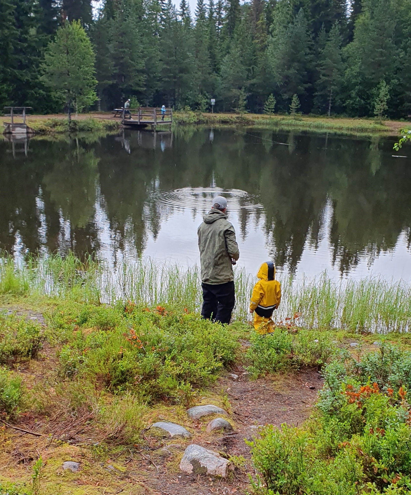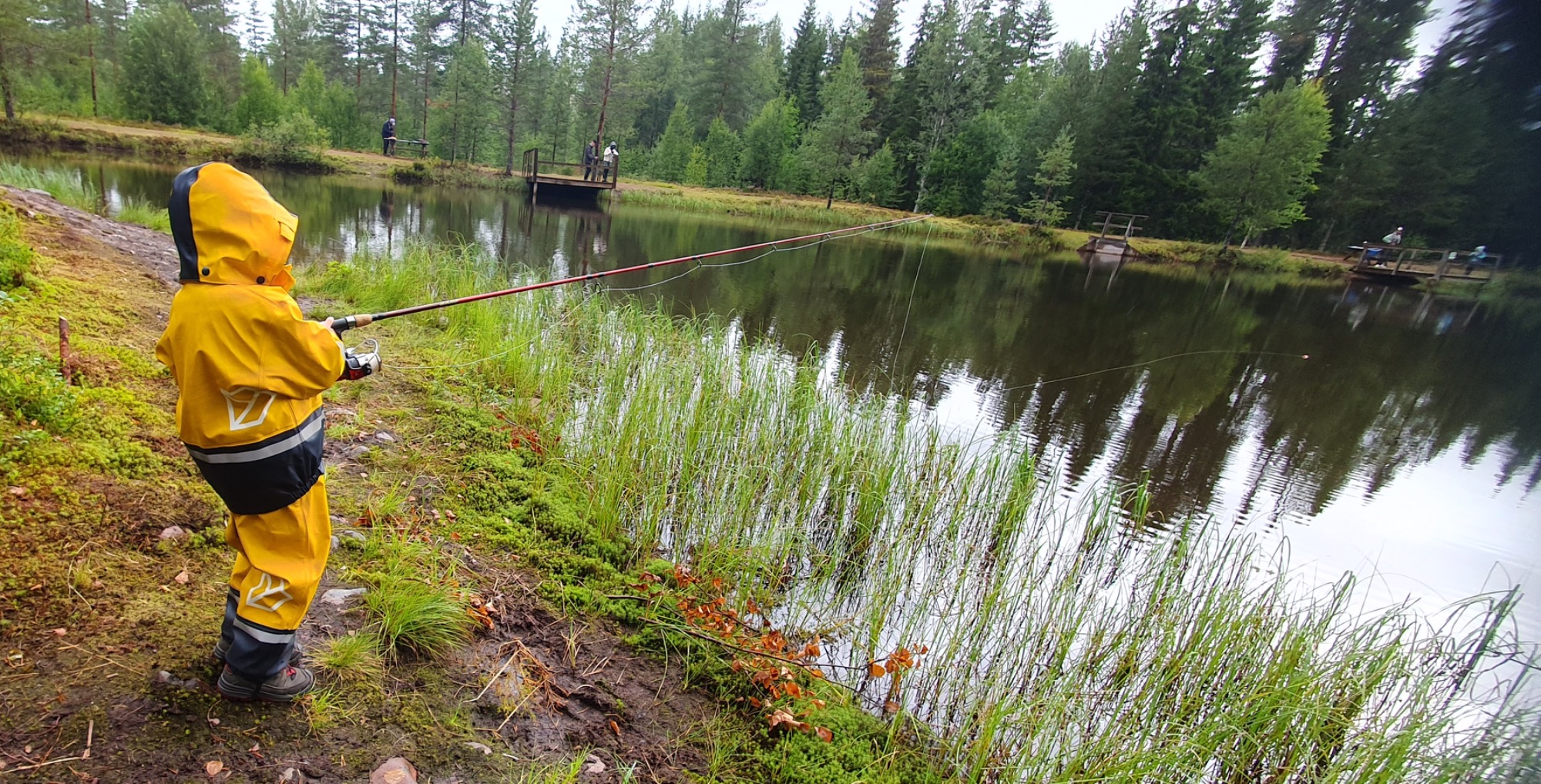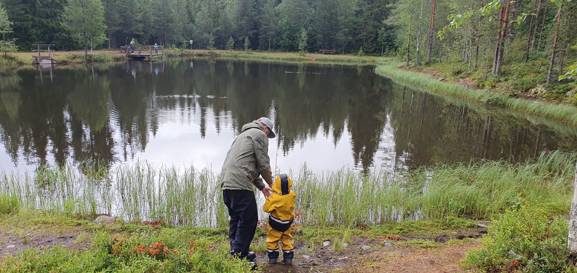 Vid det laget var fiskelusten tillfälligt slut och fokus flyttades istället till att försöka hjälpa Leo att få sin egen fisk. Han hade redan hunnit skaffa sig några nya vänner runt sjön och stod ivrigt med spöet i handen, fullt koncentrerad på flötet och räkan som dinglade under det. Men turen var inte riktigt på vår sida. Kanske var det för många flöten i vattnet, kanske var fiskarna helt enkelt mätta.